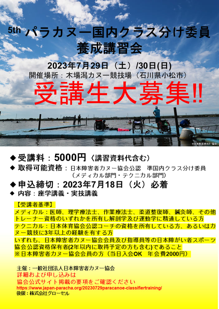 また、国内のクラス分け委員を養成することにより、全国各地で開催されるパラカヌー大会の増加と拡大を推進し、パラカヌーの競技普及と競技力向上を図る。