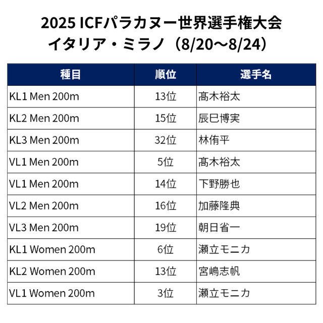 8/20(水)~8/24(日)にイタリア・ミラノで開催された「2025 ICFパラカヌー世界選手権大会」のレース結果について、お知らせいたします。