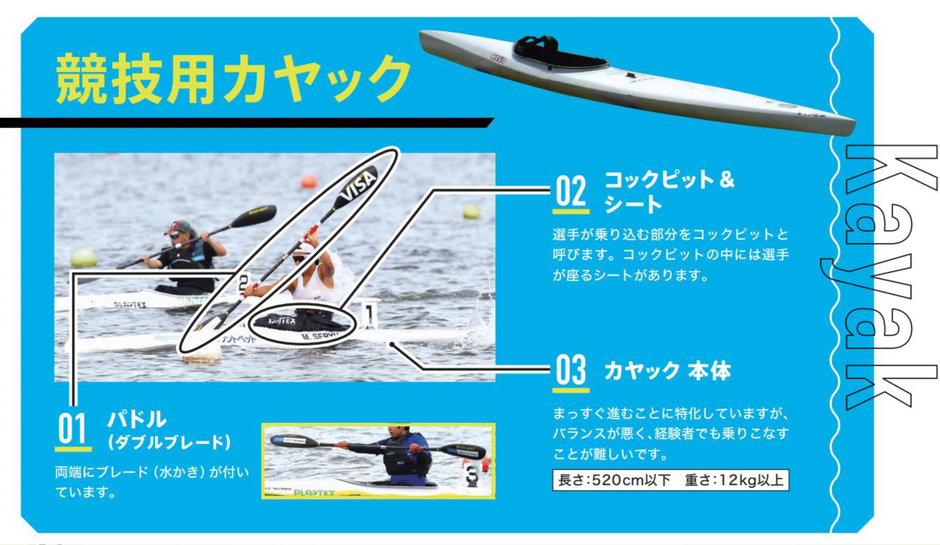 クラスにはカヤックを表す「K」、またアウトリガーカヤックのヴァーを表す「V」をクラスの前につけて表記します。