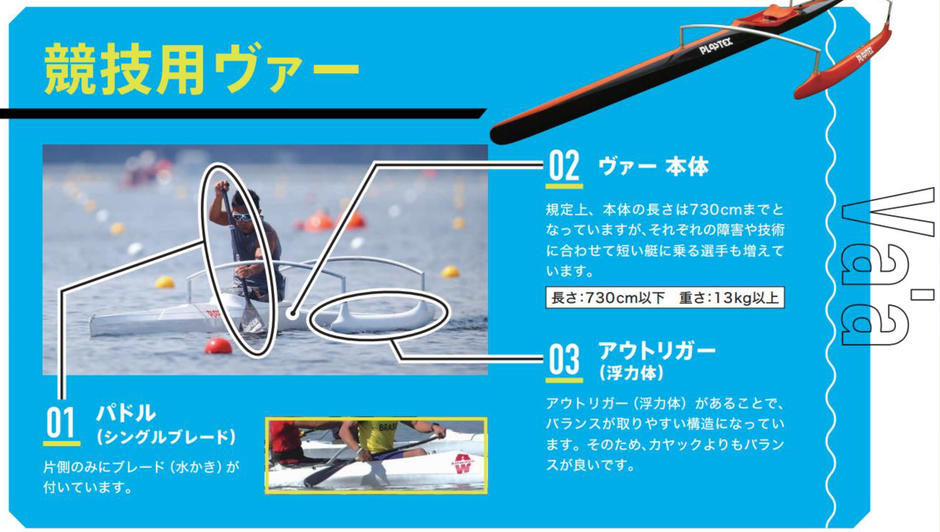 カヌー競技には、脊髄損傷、下肢切断、片麻痺、二分脊椎など、「主に下肢に障がいのある選手」が参加します。
